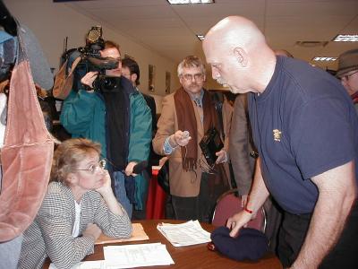 (3/1/01) - Gov. Ventura tours the Minnesota Workforce Center in Blaine. Ventura is talking with Judy Bartels of Lino Lakes, who is wondering why she can't find a job when so many are available. She also questions whether Ventura's workforce development restructuring will lead to layoffs.