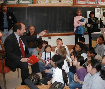 (3/5/01) - Sen. Paul Wellstone reading Biddy Mason to 4th graders at Jackson Preparatory Magnet School in St. Paul. Wellstone says Gov. Ventura's education budget combined with President Bush's budget is a "double whammy." Read more.