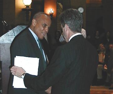 (4/17/01) - Harry Belafonte appeared at the Capitol Tuesday to back the building of a civil rights tribute as part of a new Roy Wilkins Center next to St. Paul's RiverCenter