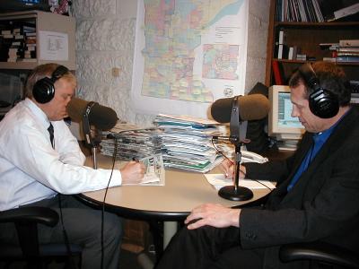 (5/22/01) - The day after the legislative session ended in deadlock, Senate Majority Leader Roger Moe (left) and House Speaker Steve Sviggum (right) sit together in MPR's Capitol bureau. They're talking with MPR's Gary Eichten about their differences. Listen to their comments.