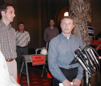 (6/5/01) - House Speaker Steve Sviggum and Majority Leader Tim Pawlenty erected road construction props outside the Senate chamber, to blast Senate Democrats for "holding up a budget deal."