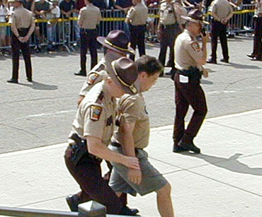 Four people were arrested for causing minor infractions, including this man who jumped over the fence separating the counter-demonstrators from the KKK members.