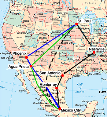 Maria's family members took different routes, at different times, to enter the U.S. To read more about their journeys, move your mouse over the points on the map.